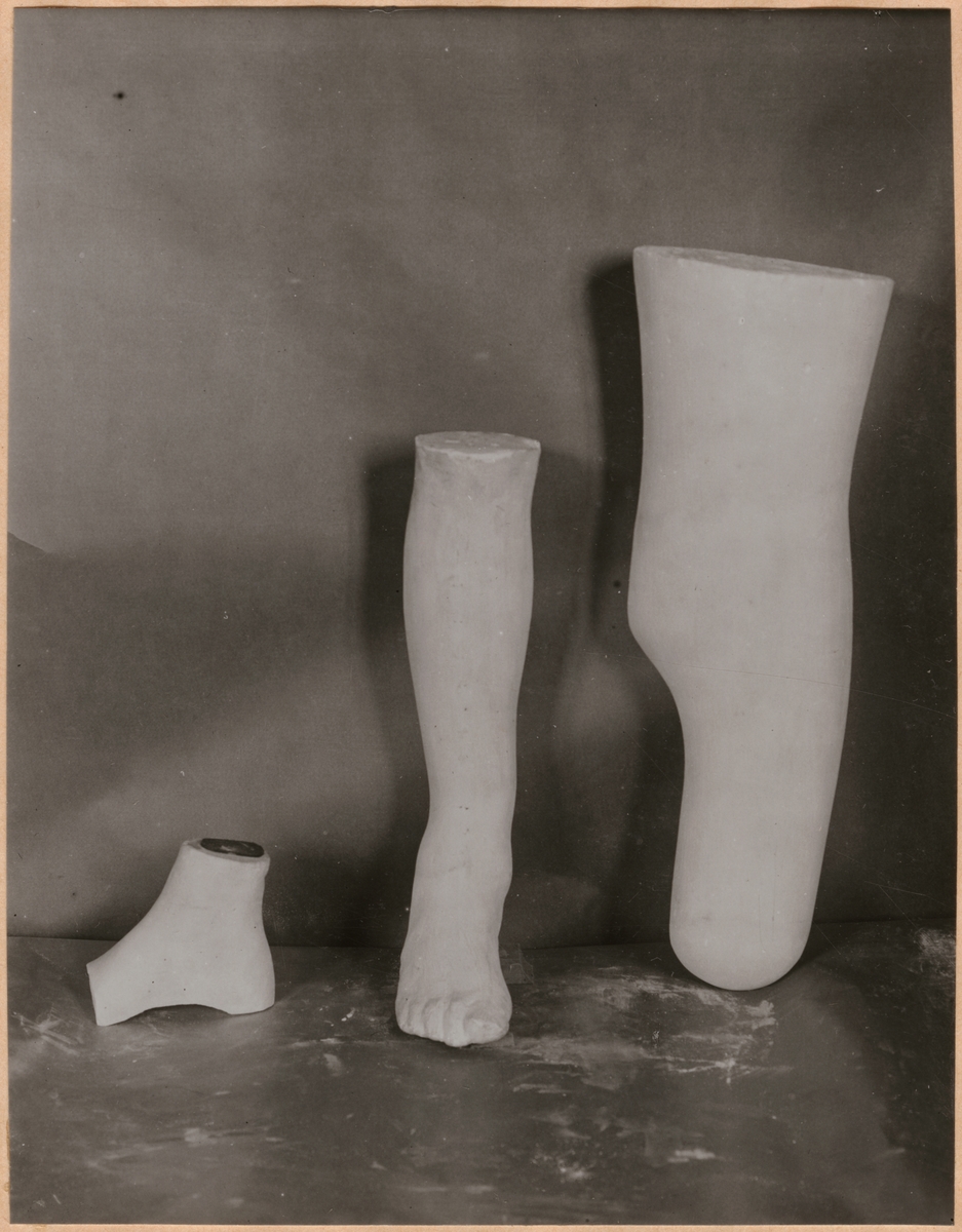 Visar positiva gipsavgjutningar av lårbens- underbens och fotamputeringar, första delen i tillverkningsproceduren av proteser.