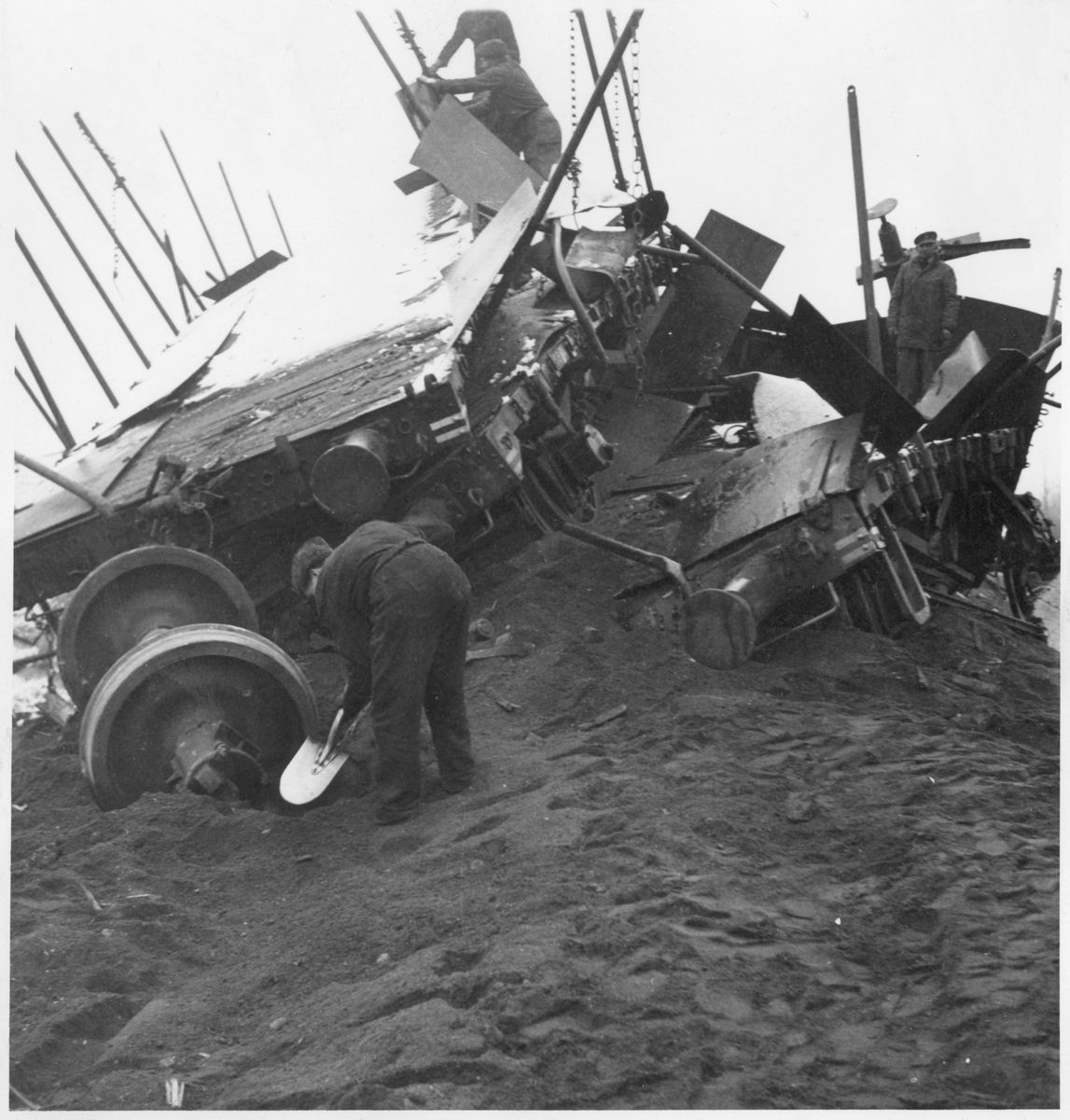 Arbete vid urspårning med vagn och personal i bild mellan Håmojåkk och Linaälv.
