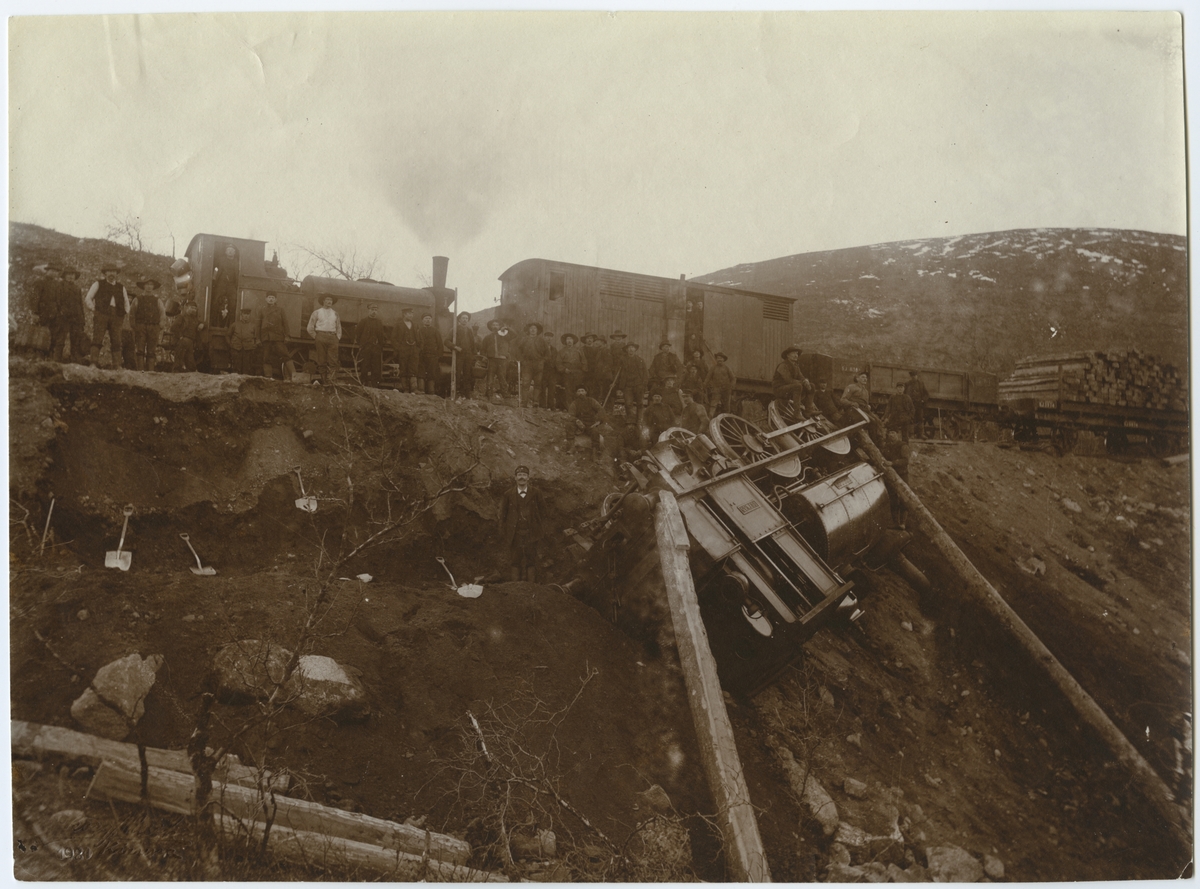 Olycka vid Nakerijokk 24 september 1900. Ett av byggnadsloken,"Dufvan", har spårat ur i rasat ned längs banvallen. Hjälptåget dras av ett tanklok från före detta Sverige & Norge Järnväg, S&N.
