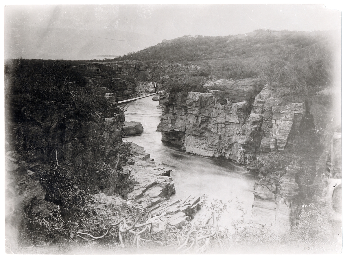 Vattentunnel vid Abiskojokk.Enda första bryggan över Abiskojokk innan vattentunneln sprängdes under järnvägsbanken tagit 1900.