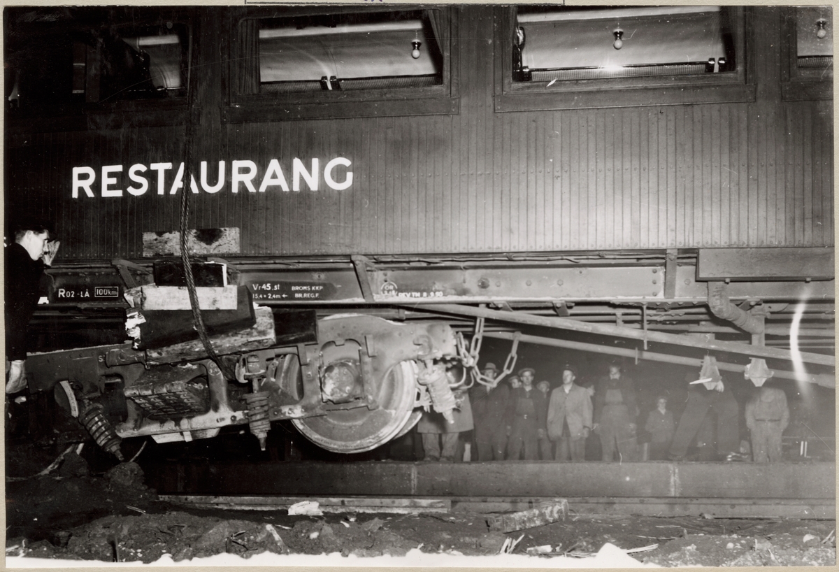 Närbild på restaurangvagn medan den blir lyft av kran efter olycka mellan Ålbo och Järlåsa.