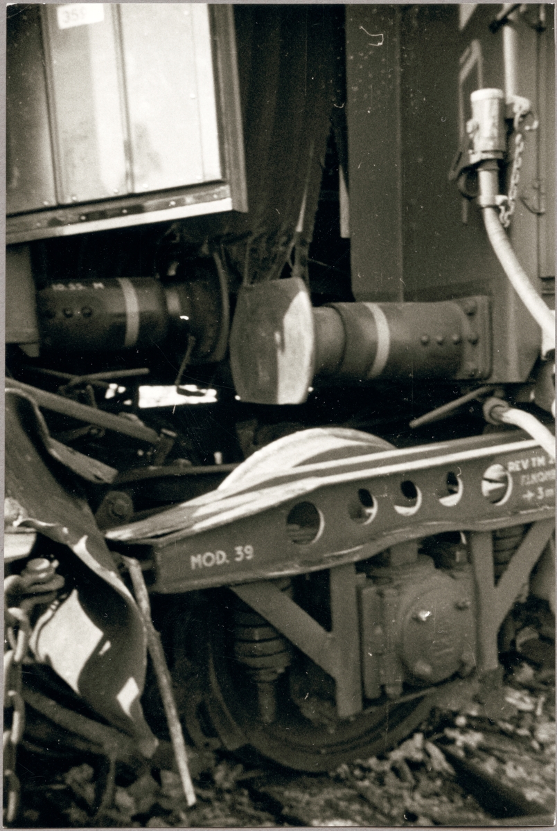 Titel: Närbild på stötdämpare och boggi från vagn skaded vid tågolycka.