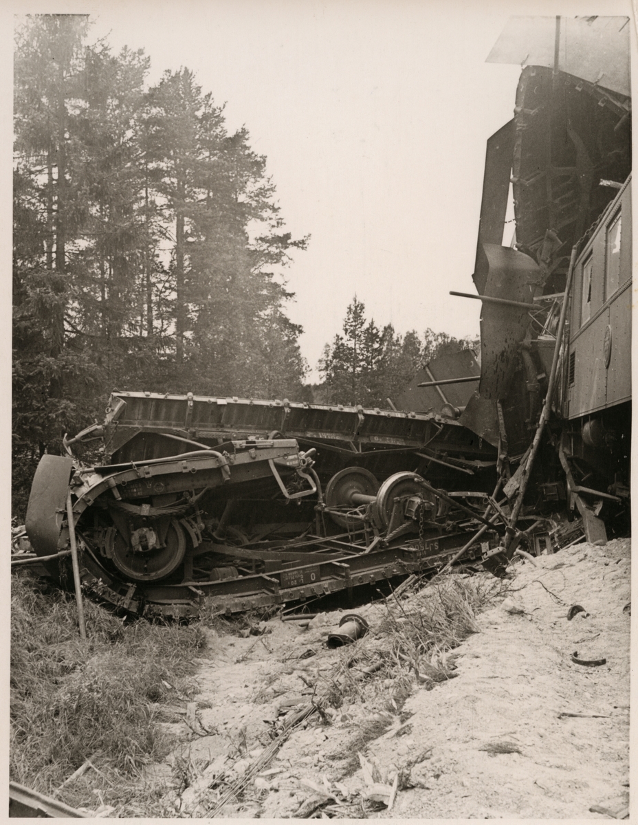 Statens Järnvägar, SJ D 595 med krockskadad godsvagn efter olycka i Mellansjö augusti 1945.