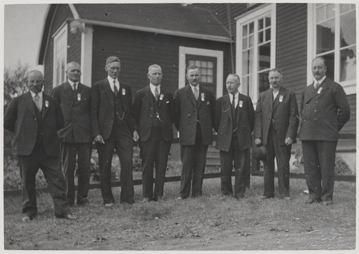 Bild på män som fick medalj vid invigningen av Statsbanan Malung-Vansbro. Medaljerna delades ut av Statsrådet kommunikationsminister Henning Leo samt Statens Järnvägars Generaldirektör Axel Granholm.