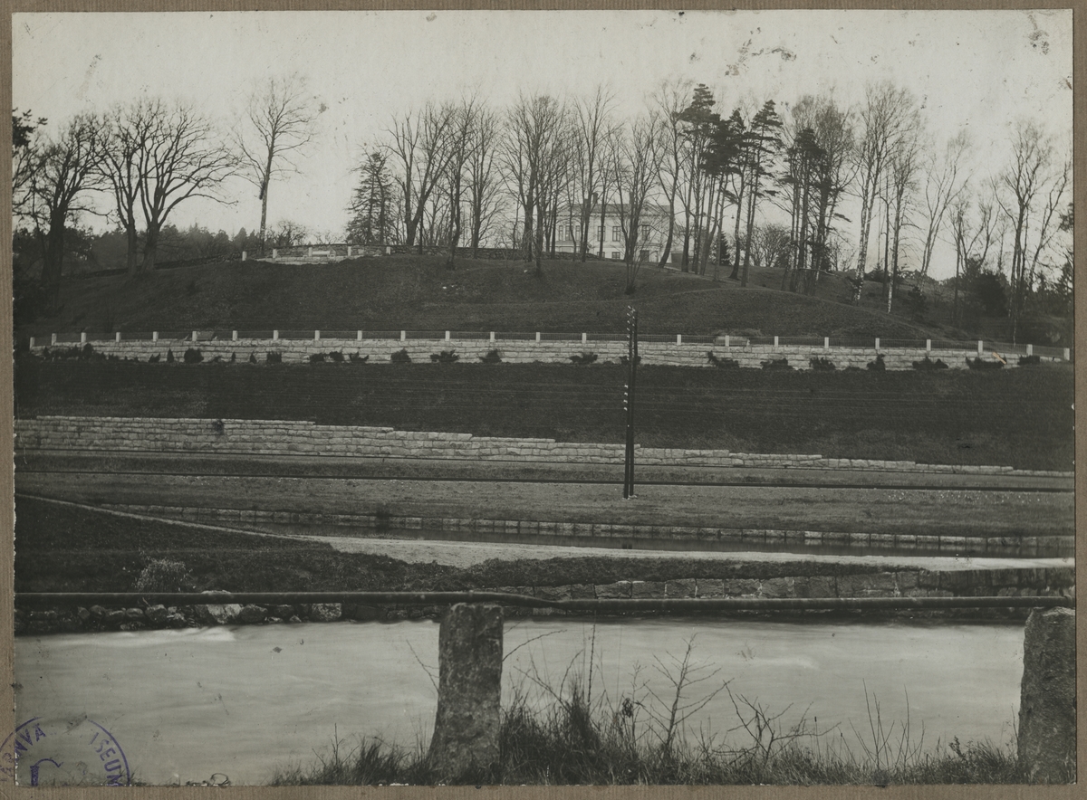 Dubbelspårsbanbyggnad Göteborg - Alingsås. Stödmurar vid herrgården i Jonsered, år 1916.