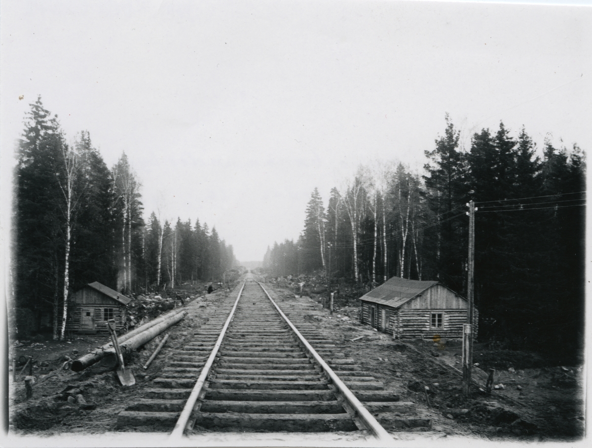 Möjligen fotograferat efter arbetsdagens slut då det ryker ur kaminröret till den vänstra baracken och personer saknas i bild.