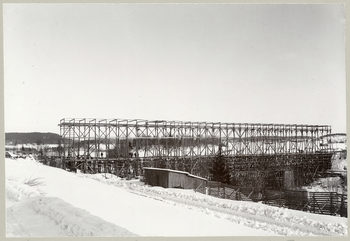 Ställningsbyggnad för brobygge vid Forshufvud över Dalälven.