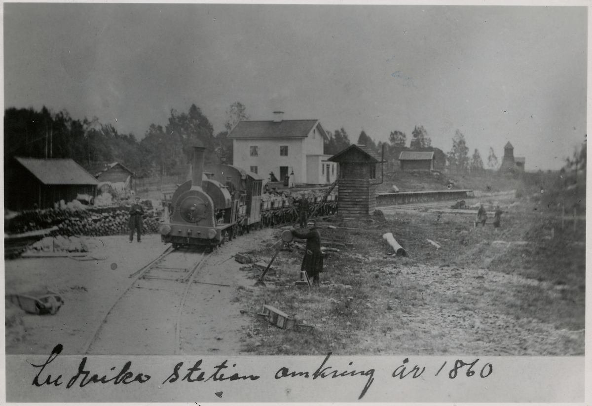 Ludvika station. Smedjebackens Järnväg, Smbj Lok. Mannen till vänster om loket är stationsinspektor Rosén.