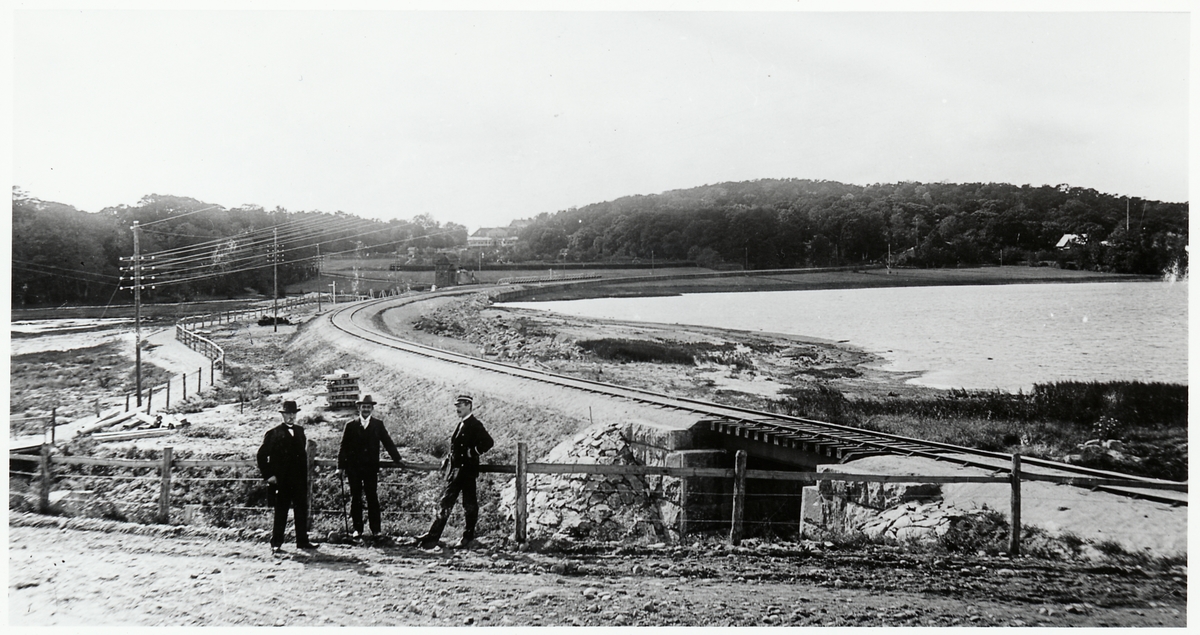 Personerna från vänster i bild: August Carlsson - grosshandlare, Shultz - ingenjör från danmark, Heine - Stins på Släps station, står framför den färdigställda delsträckan någonstans mellan Munkekullen - särö västerskog.