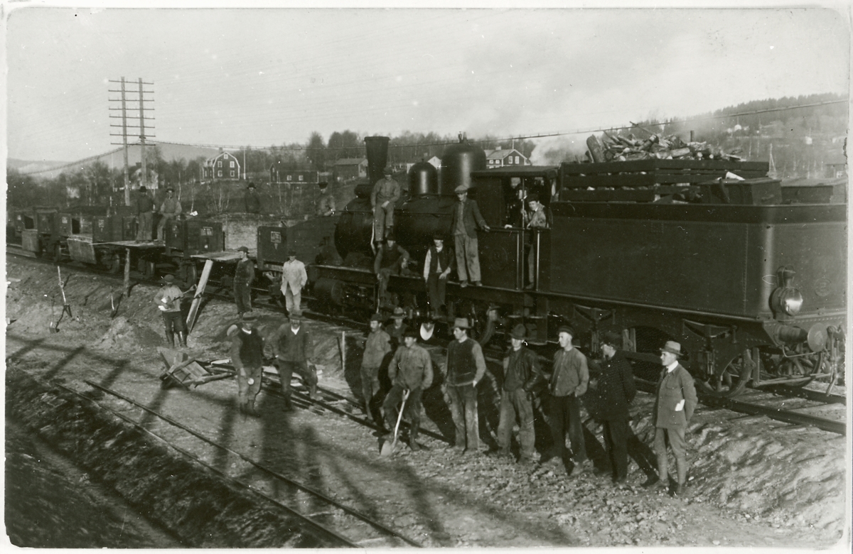 Statens Järnvägar, SJ Kd2 454. Första ångtåget på linjen mellan Sundsvall och Härnösand. I Nacksta, Sundsvall, står arbetslaget uppställda för fotografen och längst till höger i bild syns överbanmästare, öbm, Ohlsson.