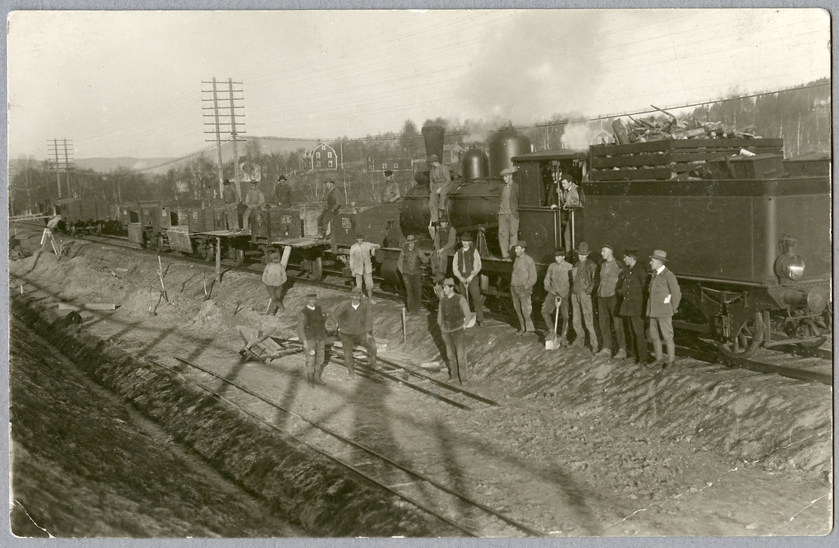 Statens Järnvägar, SJ Kd2 454. Första ångtåg på linjen mellan Sundsvall och Härnösand. I Nacksta, Sundsvall står arbetslaget uppställda och längst till höger i bild syns överbanmästare, öbm, Ohlsson.