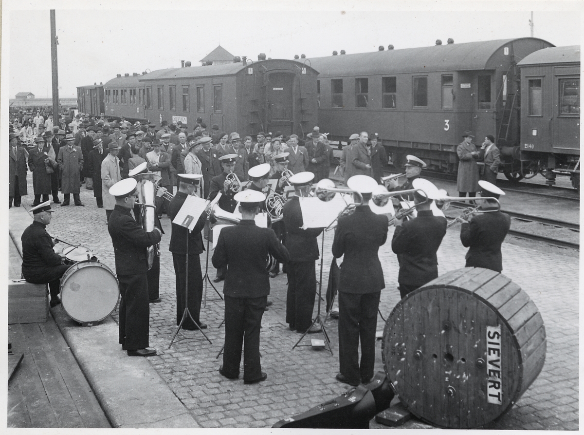 Musikkåren spelar för dom danska flyktingarna vid ankomsten till Malmö. Statens Järnvägar, SJ C10 2140.