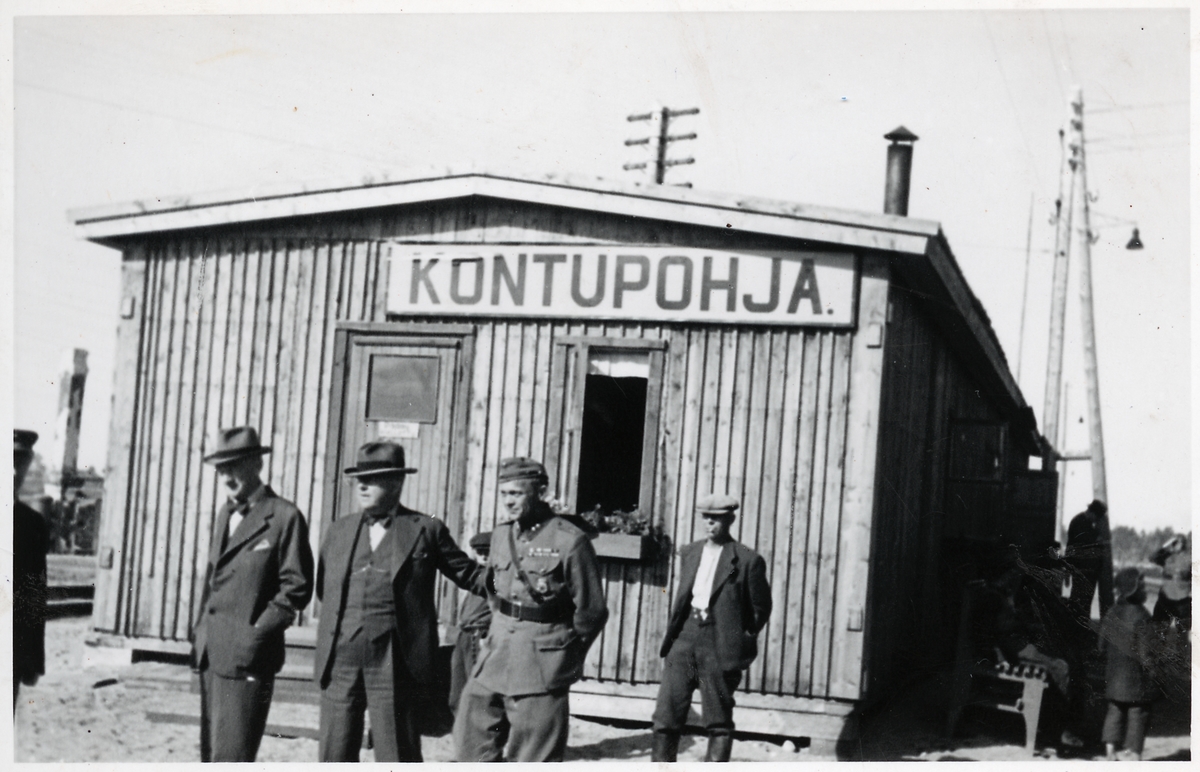 Två generaldirektörer framför stationshuset i Kontupohja.
