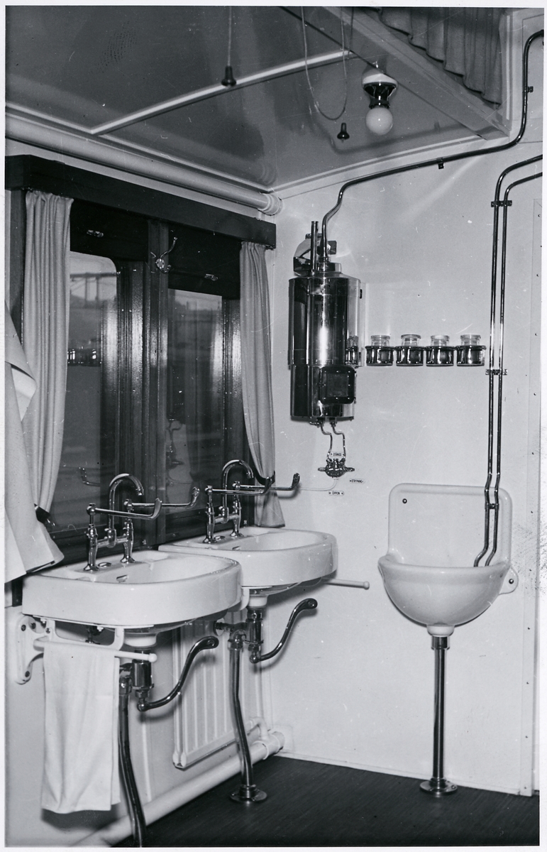 Titel: Interiör från utställningståget "SJ i försvarets tjänst". Tvättrum i ambulanståg.