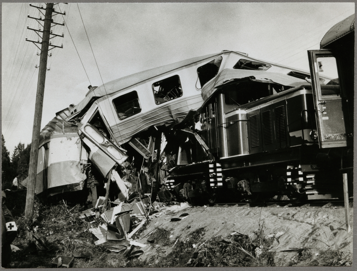 Efter kollisionen mellan ett extratåg och ett rälsbusståg på linjen mellan Grycksbo och Sågmyra 1958.