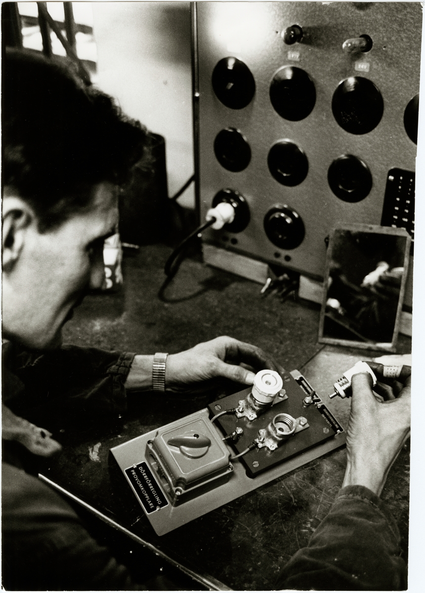 Arbete med säkringsplint till dörreglering för rälsbuss i Trafikaktiebolaget Grängesberg - Oxelösunds Järnvägar, TGOJ verkstad, Eskilstuna.