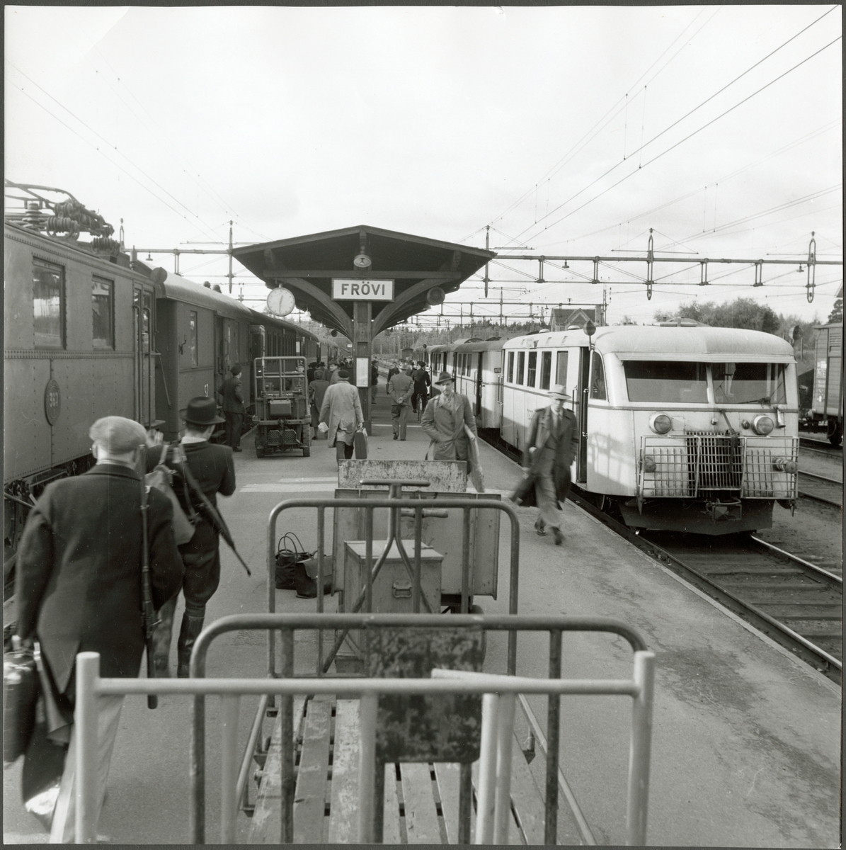 Vy över plattformen på Frövi station med en perrongtruck i mitten. Statens Järnvägar, SJ D 367 och ett rälsbusståg med Trafikaktiebolaget Grängesberg - Oxelösunds Järnvägar, TGOJ Yo8 längst fram står inne.