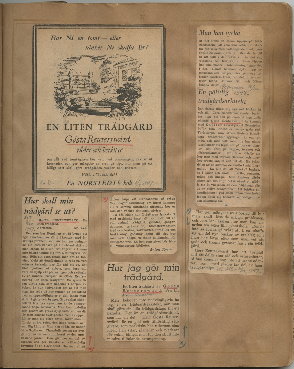 Tidningsklipp ur "Uppsatser om trädgårdar m.m. som på ett eller annat sätt beröra Gösta Reuterswärd. Samlade av Ernst Hj."