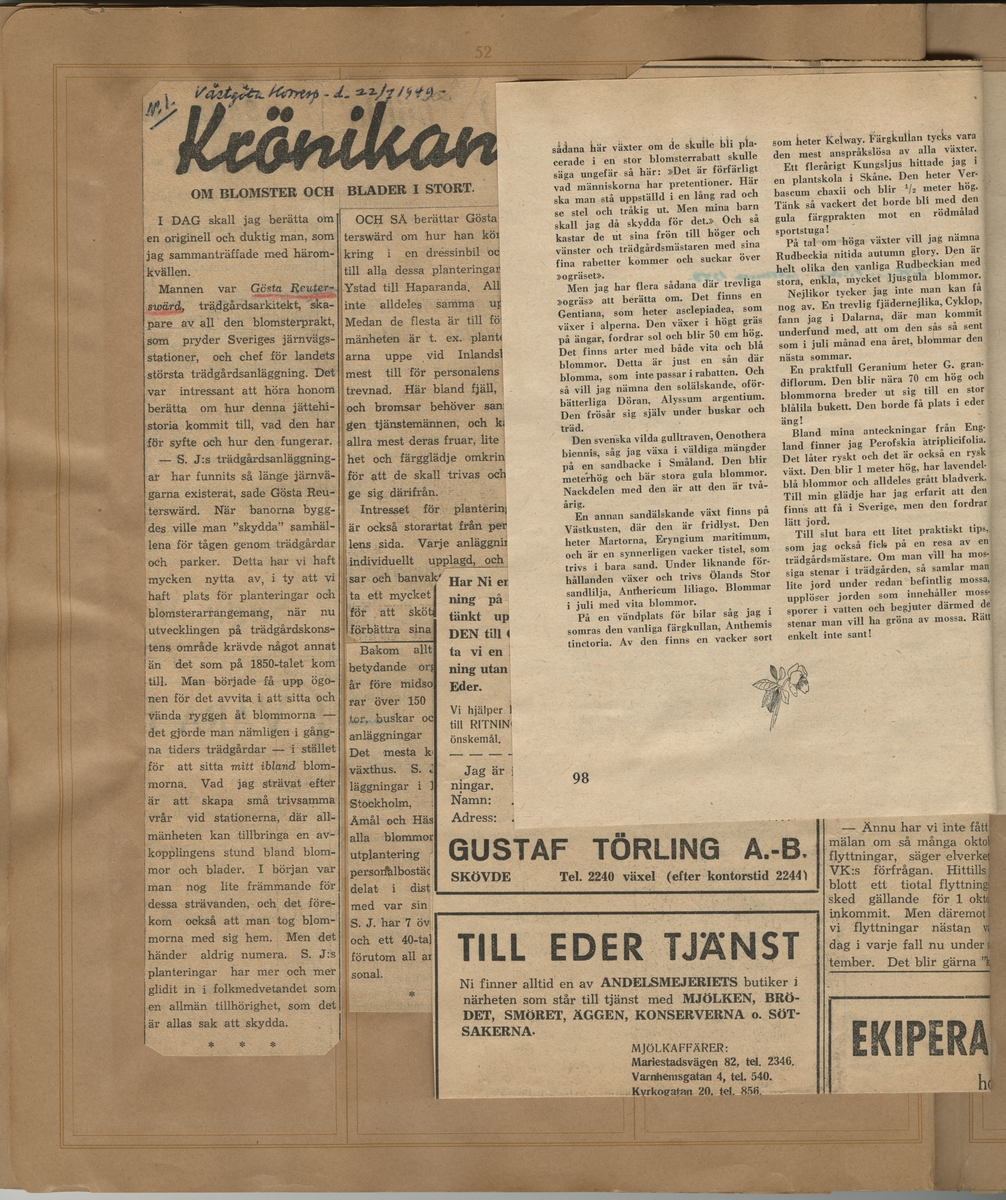 Tidningsklipp ur "Uppsatser om trädgårdar m.m. som på ett eller annat sätt beröra Gösta Reuterswärd. Samlade av Ernst Hj."