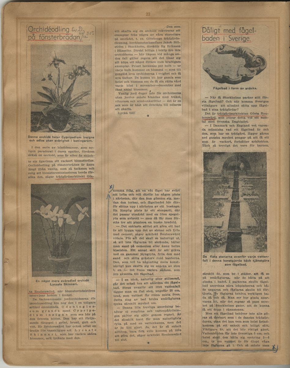 Tidningsklipp ur "Uppsatser om trädgårdar m.m. som på ett eller annat sätt beröra Gösta Reuterswärd 1931-1943".