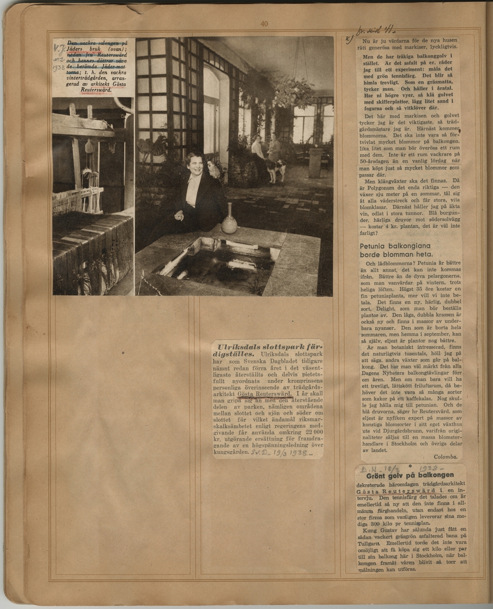 Tidningsklipp ur "Uppsatser om trädgårdar m.m. som på ett eller annat sätt beröra Gösta Reuterswärd 1931-1943".