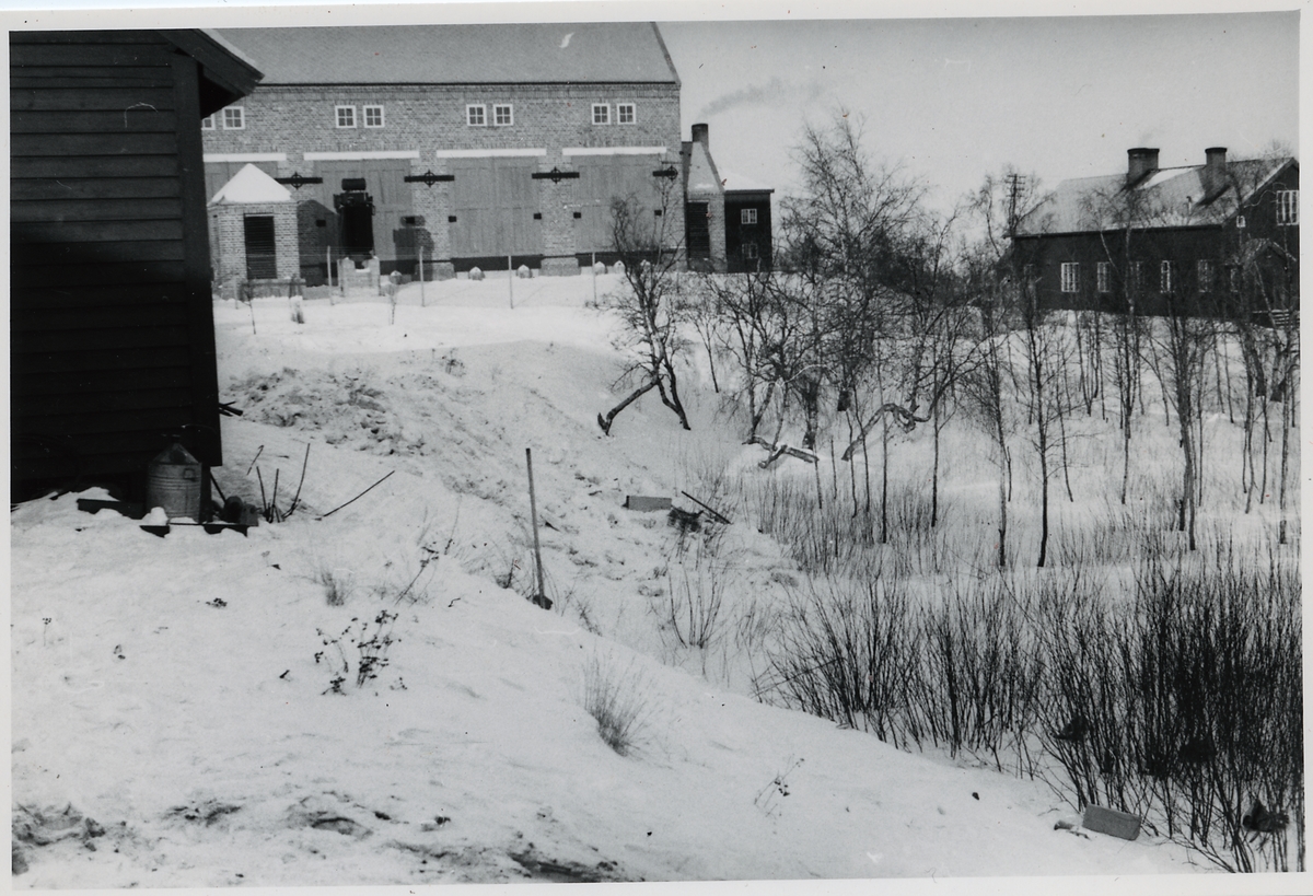 Vy över byggnader i Abisko. Alldeles till vänster på bilden syns en bit av elförrådet. Det stod tidigare närmare spåren. Detta elförråd flyttades i mitten på 40-talet för att ge plats till den nya elverkstaden som man den 21 april 1945 beslutat bygga och som stod färdig 1946.