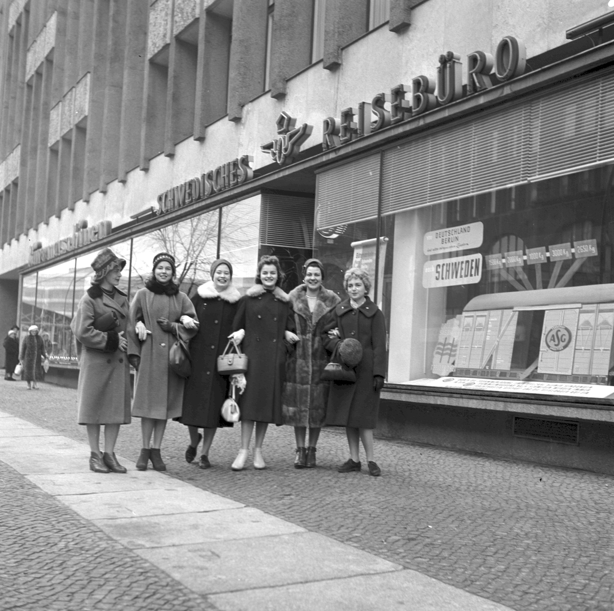 Statens Järnvägars Lucia med tärnor framför resebyrå i Berlin
