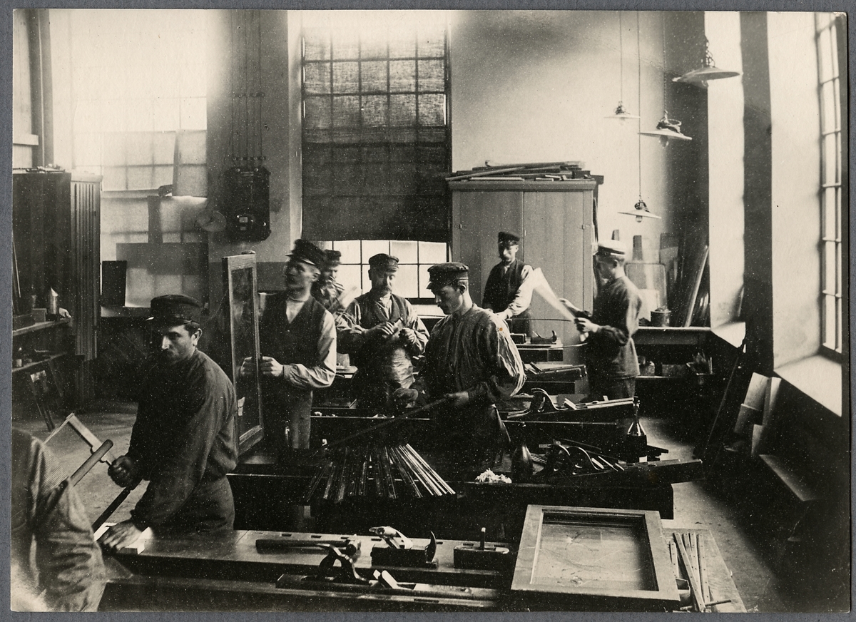 Interiör från snickeri- och sömnadsverkstaden, tillhörande Stockholm - Västerås - Bergslagens Järnvägar, SWB. Elektrisk likströmsbelysning.