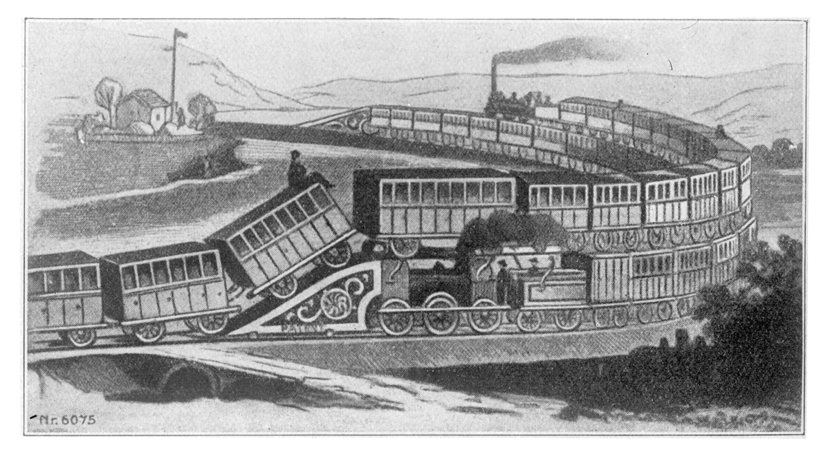 Titel: Amerikansk illustration föreställande ett fantasirikt sätt att hantera tågmöten på enkelspår.