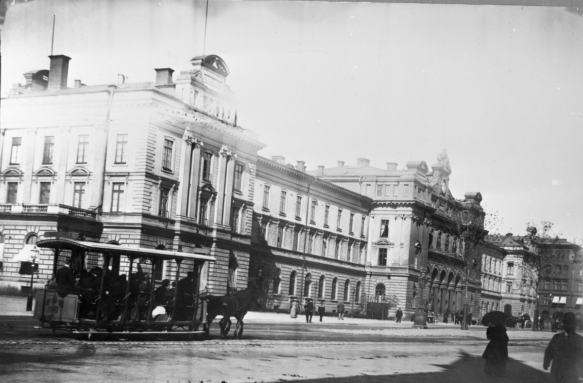 Titel: Stockholm Centralstation sedd från gatuplan. Häst dragen spårvagn på väg norrut