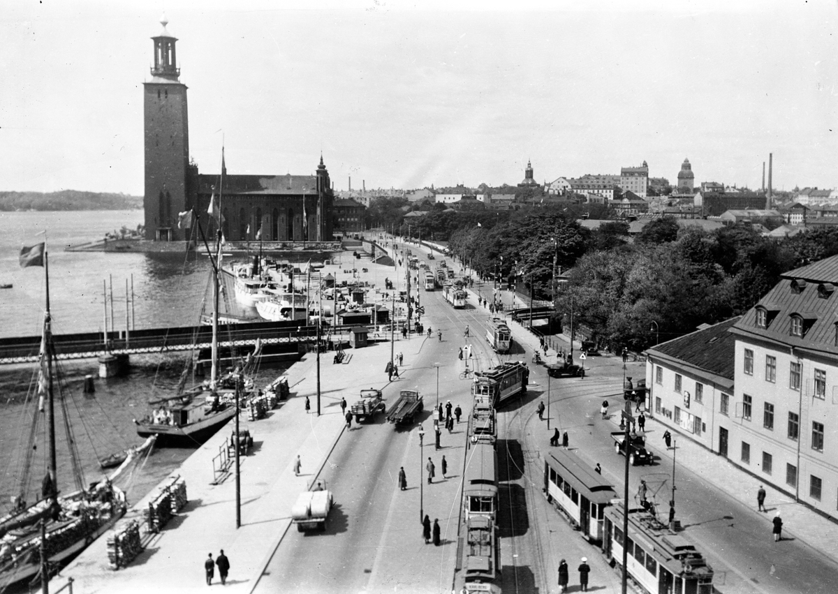 Stockholms stadshus. Spårvagnstrafik vid Tegelbacken, och del av Riddaholmsbron på Statens Järnvägars SJ:s bandel mellan Stockholm C och Riddarholmen.