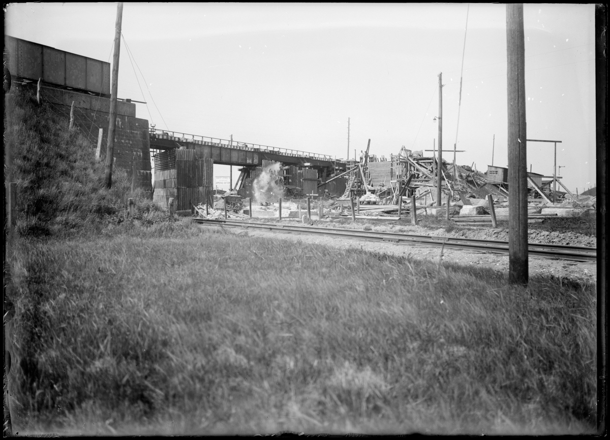 Pågående sprängning under ombyggnationen av viadukten över Malmö-Ystads Järnväg, på sträckan mellan Malmö och Trelleborg. Gamla norra landfästet nästan borttaget.