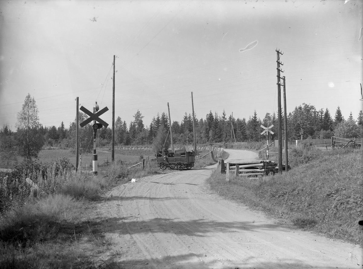 Titel: Äldre motordressin vid vägkorsning