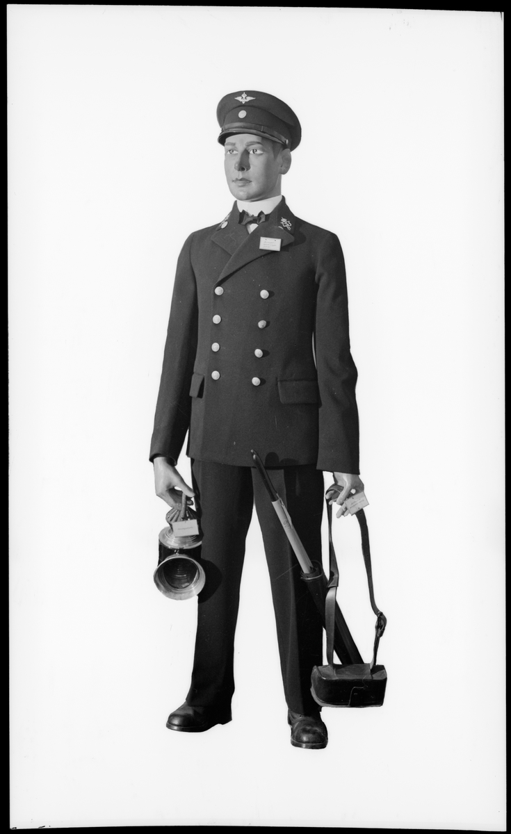 Titel: Utställningsdocka av banvakt med uniform och arbetsredskap.