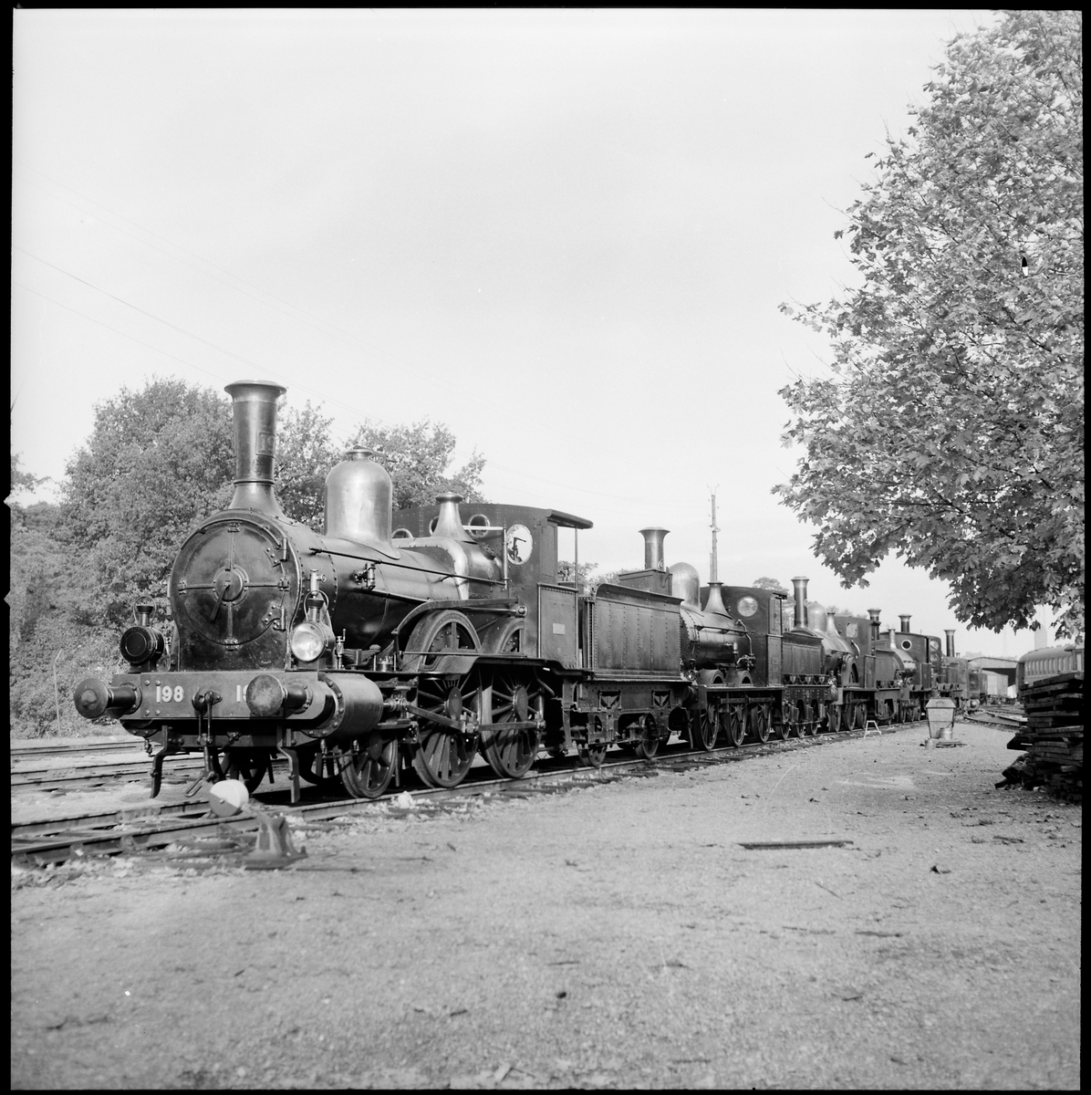 Statens Järnvägar, SJ C 198 "Breda" och andra ånglok vid järnvägsmuseums lokaler i Tomteboda.