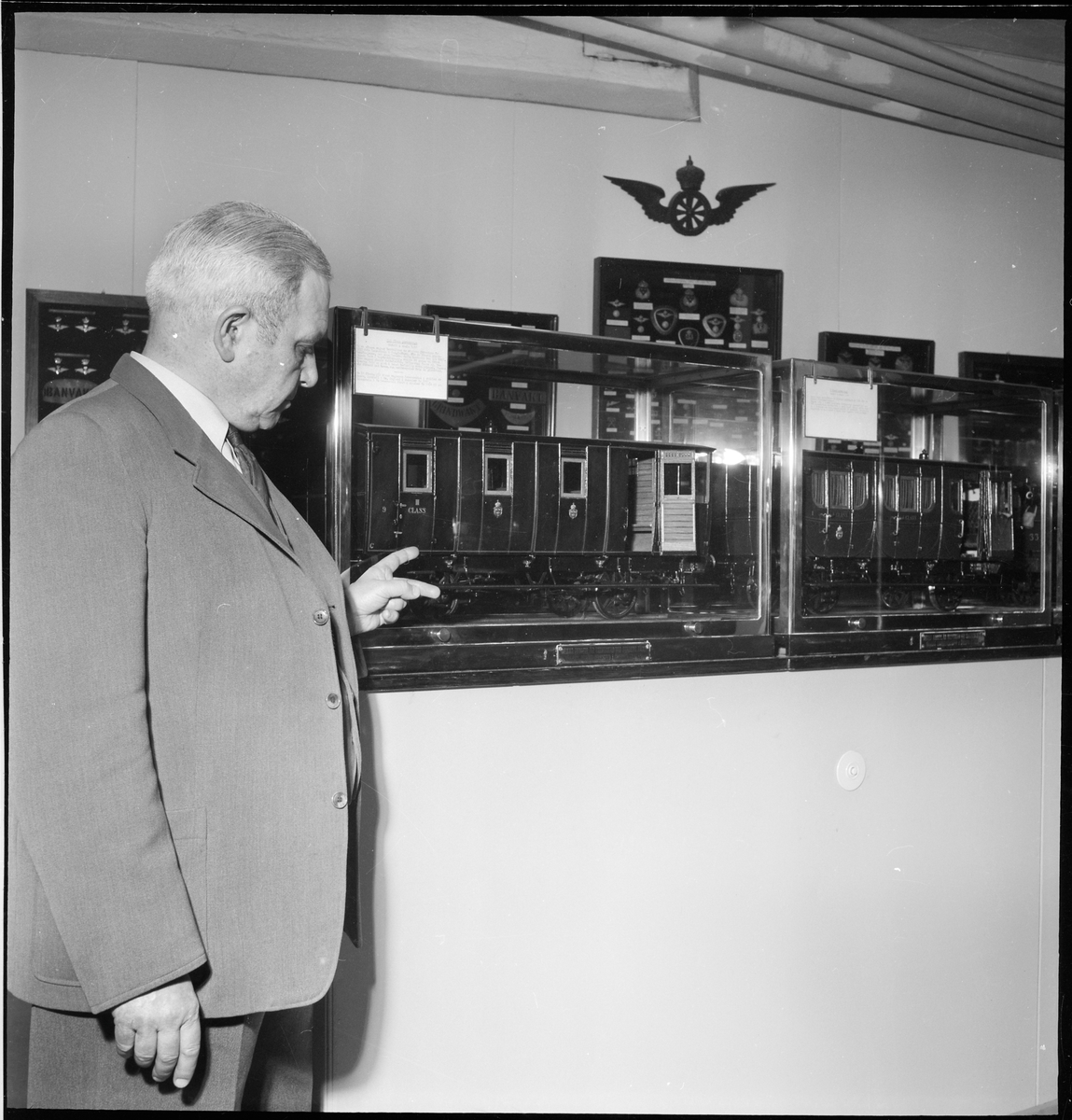 Titel: Trafikchef Nils Ahlberg framför modeller av I:a och III:dje klass personvagnar.