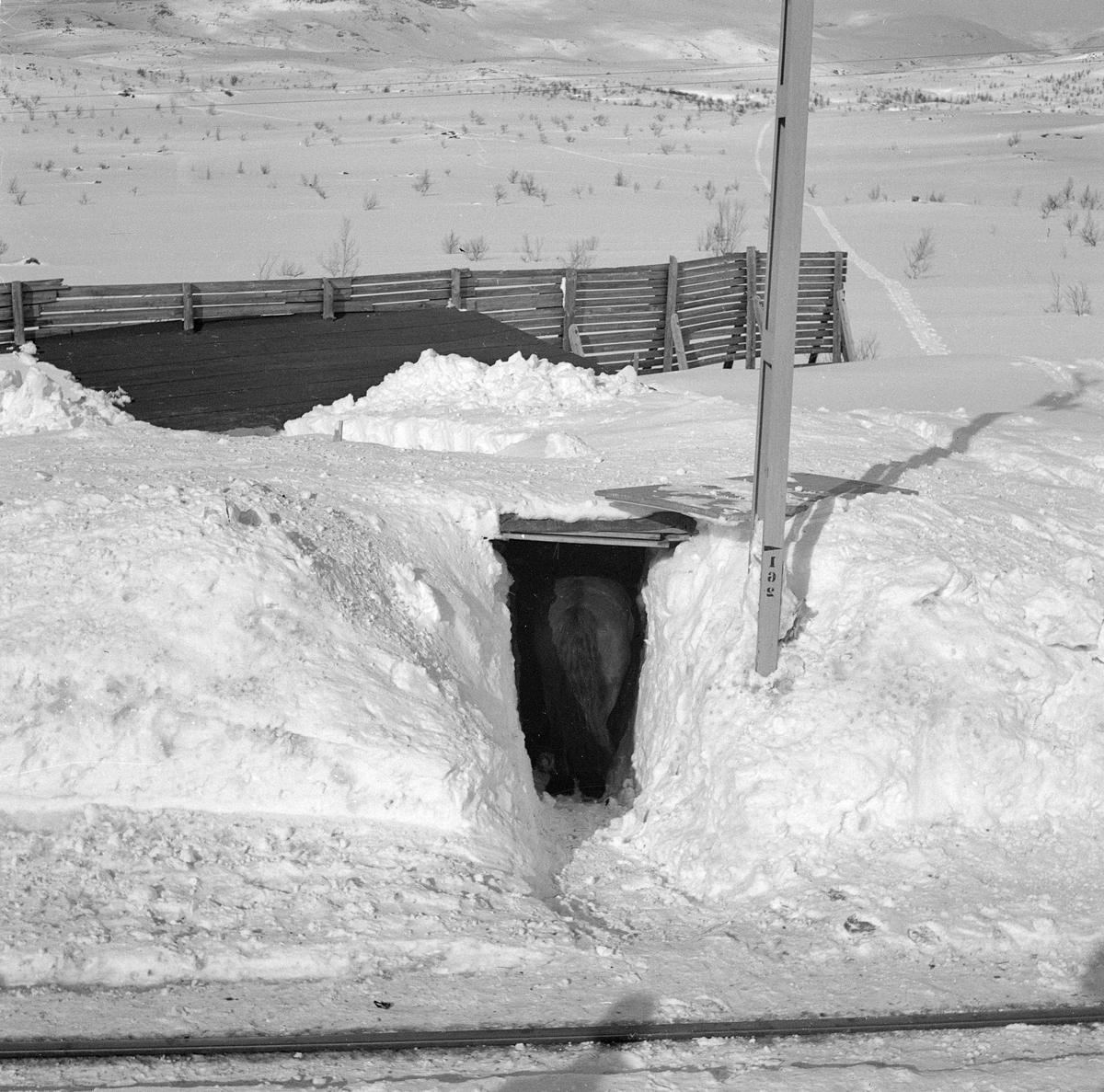 Titel: Utmed linjen. Häst på väg in i vinterstall vid Låktatjåkka. Stallet rymmer sex hästar.