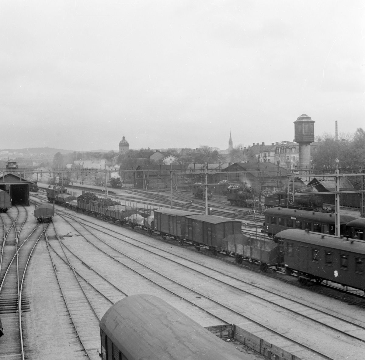 Borås bangård. På bilden syns bland annat ånglok, öppna och täckta godsvagnar samt personvagnar.