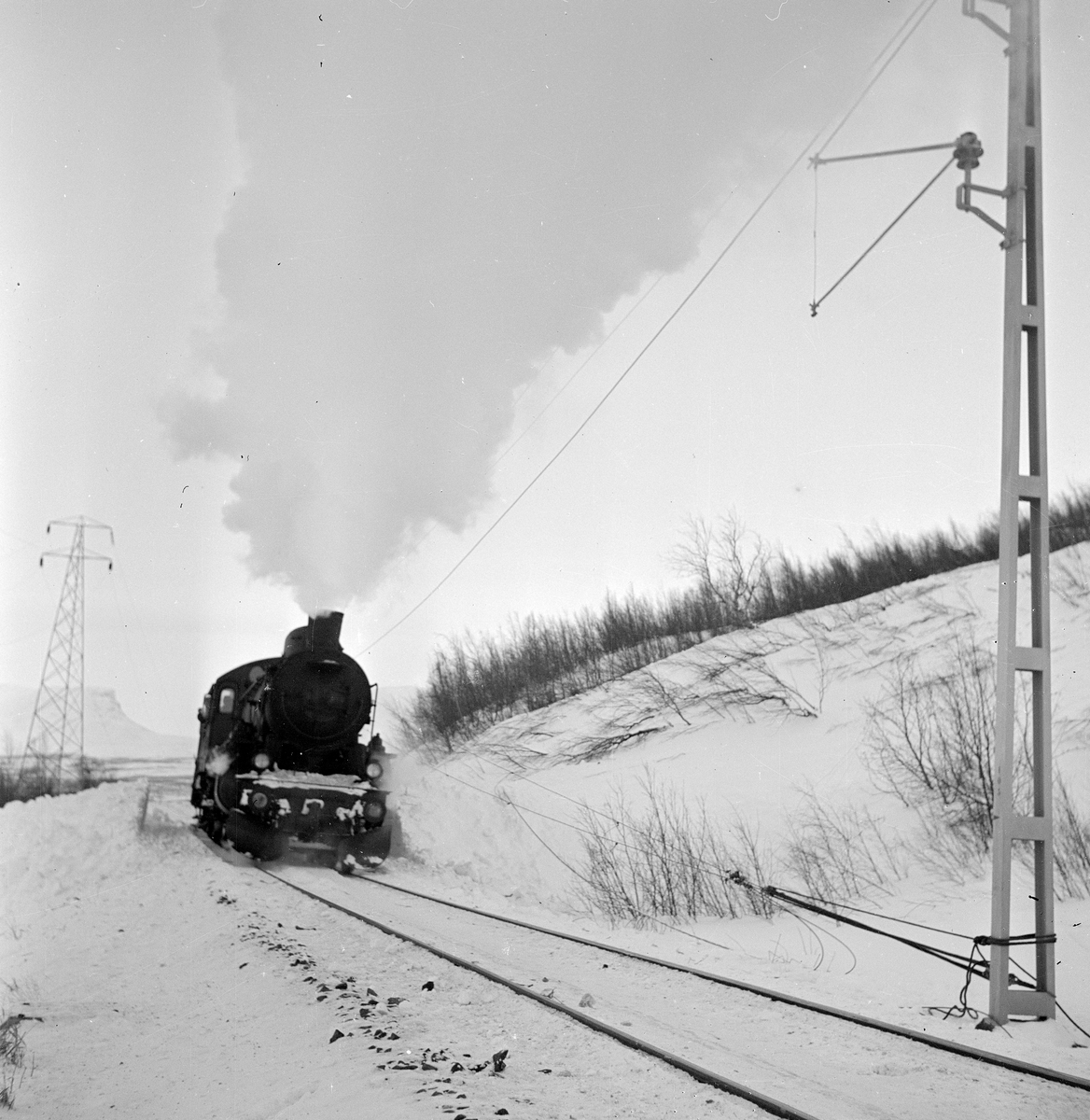 Statens Järnvägar, SJ B. Bilden tagen i samband med reparationsarbeten efter snöskred vid Malmbanan. Eftersom kontaktledningen var skadad fick ångloket rycka in och dra reparationståget.