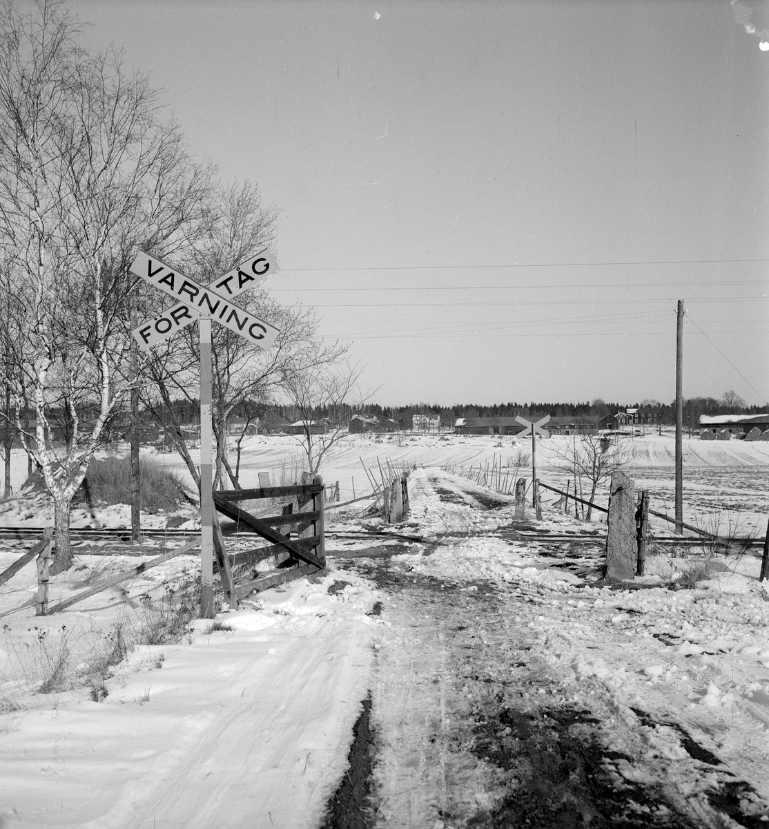 Vägövergångar med kryssmärke, varning för tåg. Bilden är tagen nånstans på vägen Hällstigen - Enköping - Runhällen.