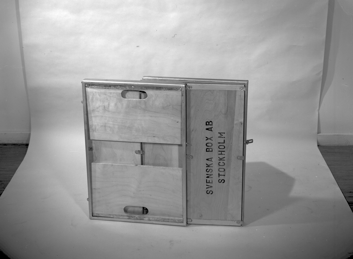 Titel: Hopfällbara lådor. Småbehållare med texten Svenska box ab Stockholm.