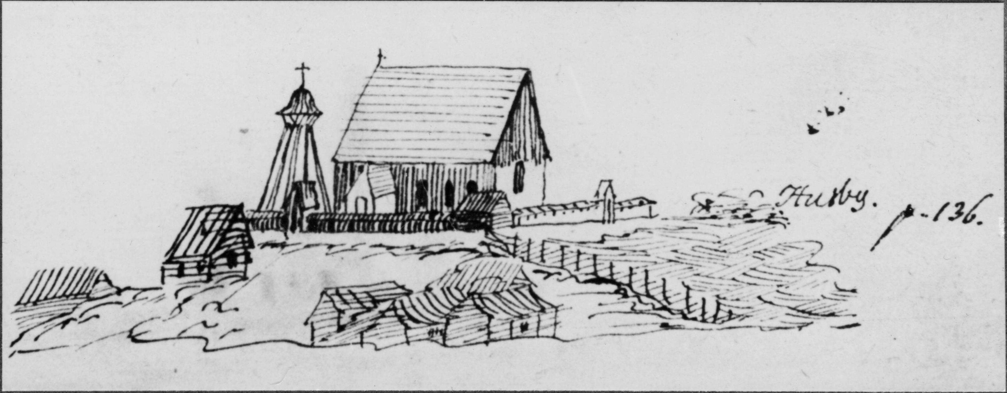 Kyrkan med omgivning, mot sydöst. Osignerad skiss.