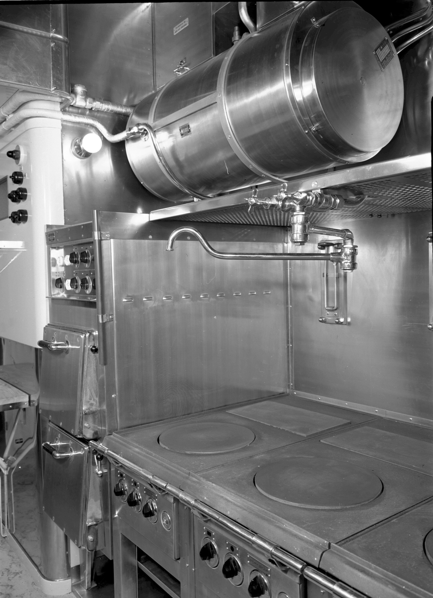 Restaurangvagn, Statens Järnvägar, SJ RO3, interiörbild. Del av köksavdelningen