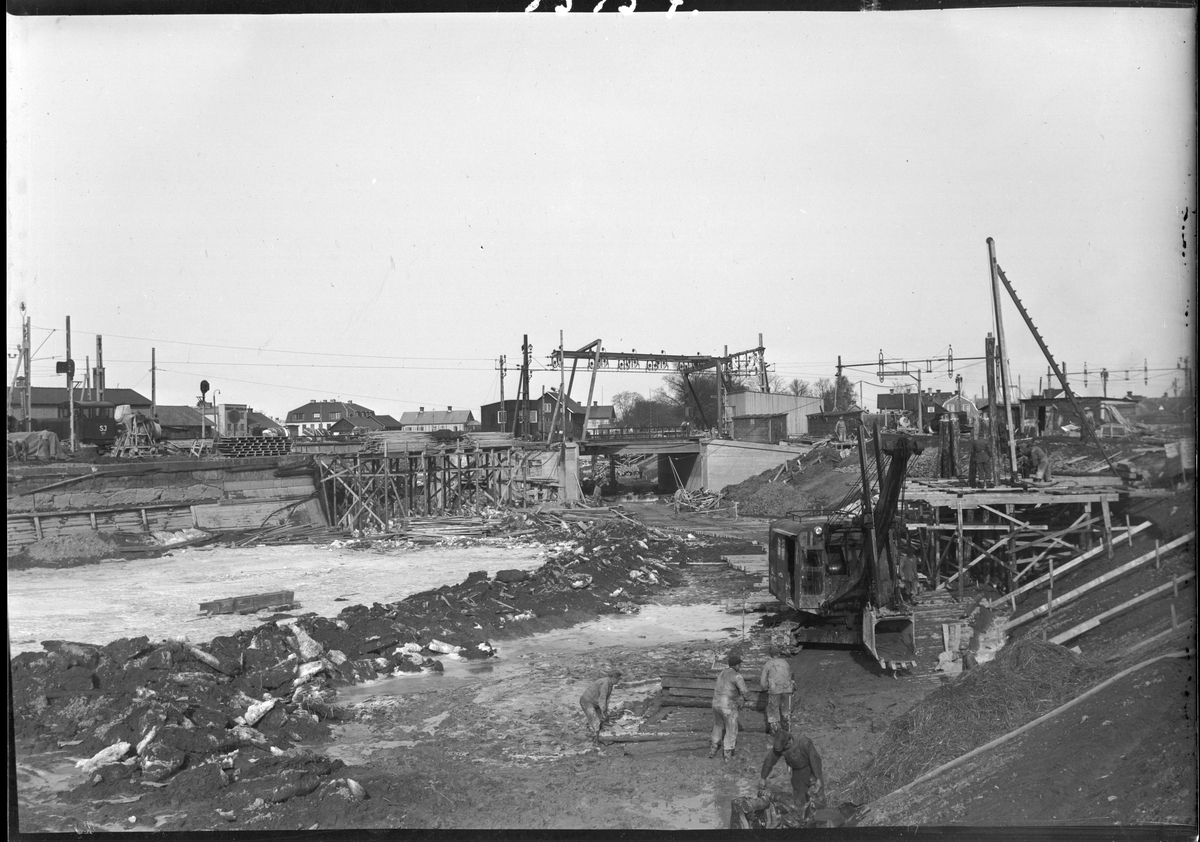 Dubbelspårsarbete. Gårdsjö till Skövde. Bro över Göta kanal vid Töreboda. Omgrävning av kanalfåran.
