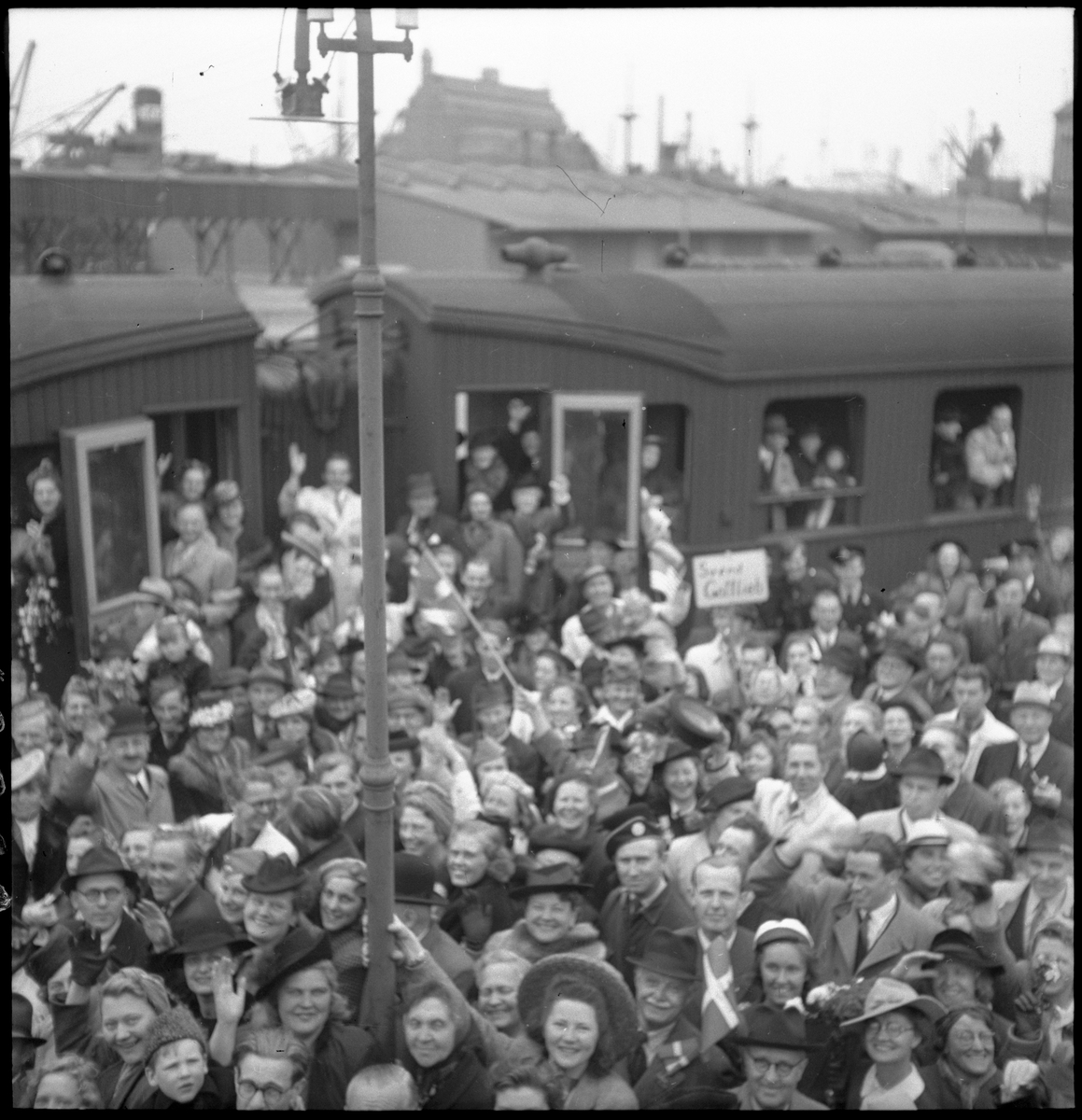 Anhöriga i väntan på ankomsten av de hemvändande flyktingarna. Köpenhamns frihamn. Skylt med text: Svend Gottlieb.