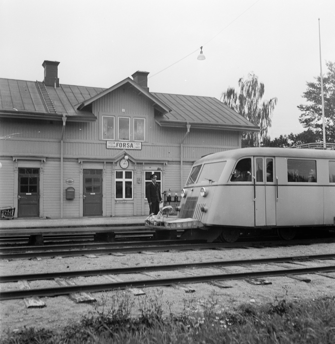 Titel: Forsa järnvägsstation. En Hilding Carlsson rälsbuss på spåret.