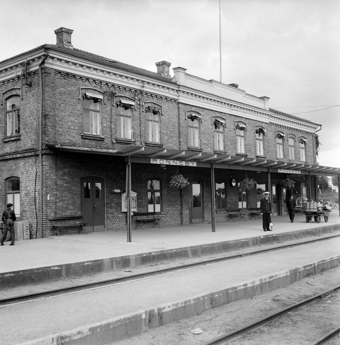 Titel: Stationen anlades 1888. Tvåvånings stationshus i tegel . På plattformen står en stins.