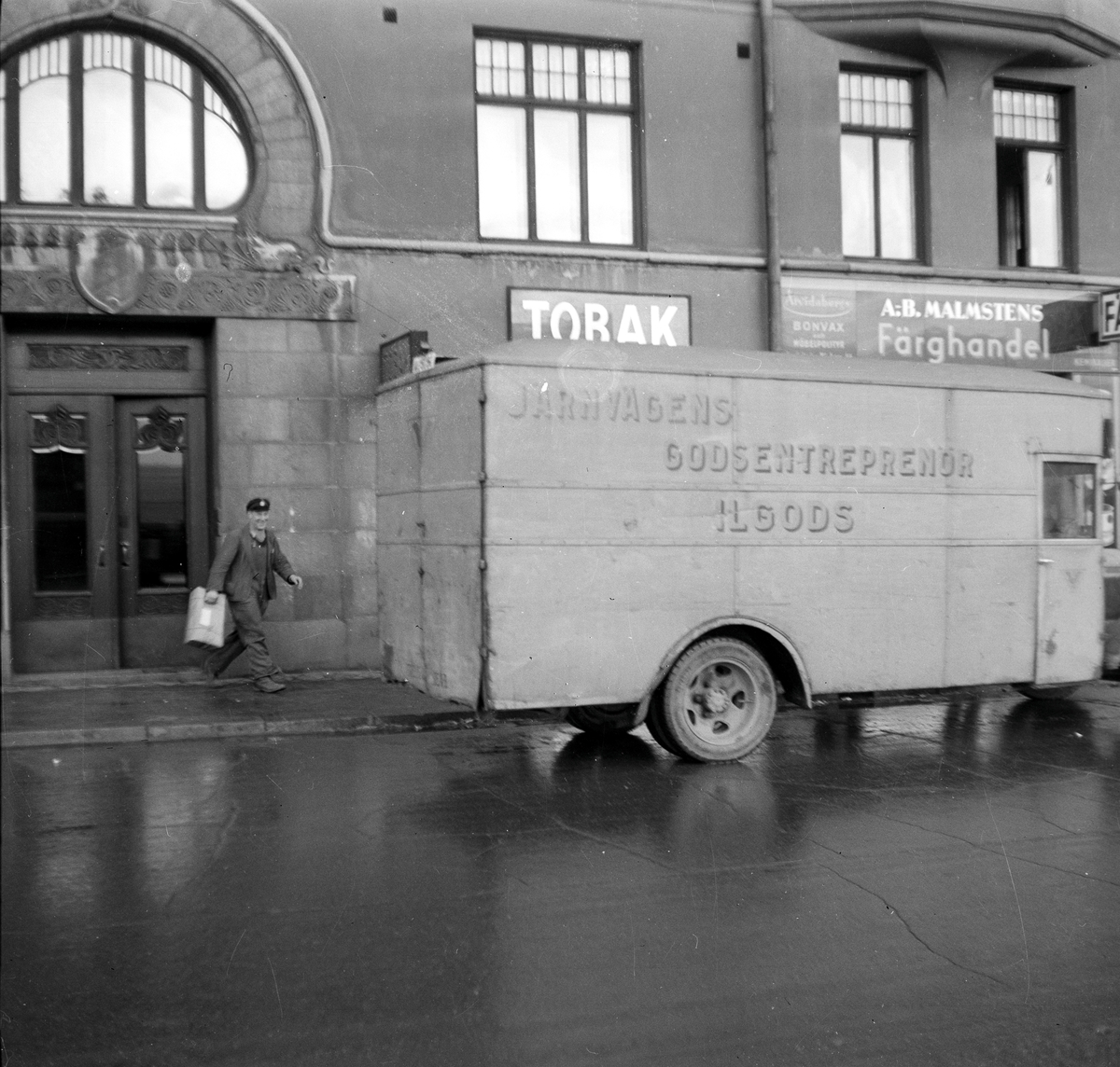 Titel: Godstrafiken. Järnvägens entreprenör Freys hämtar gods " från dörr till dörr"