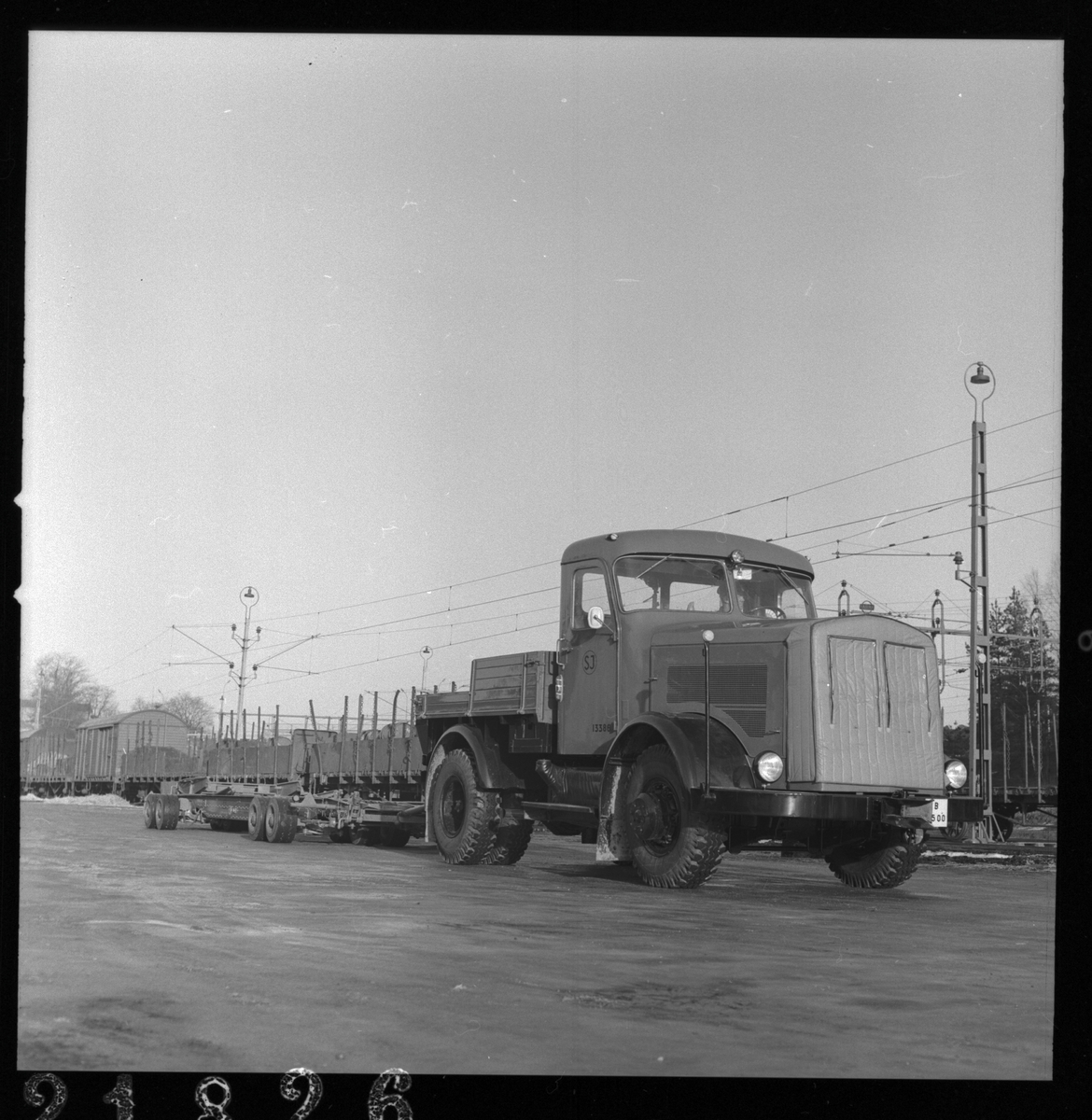 Lastbil SJ 13385. Dragfordon av märket Kaelble med vagnbjörn.