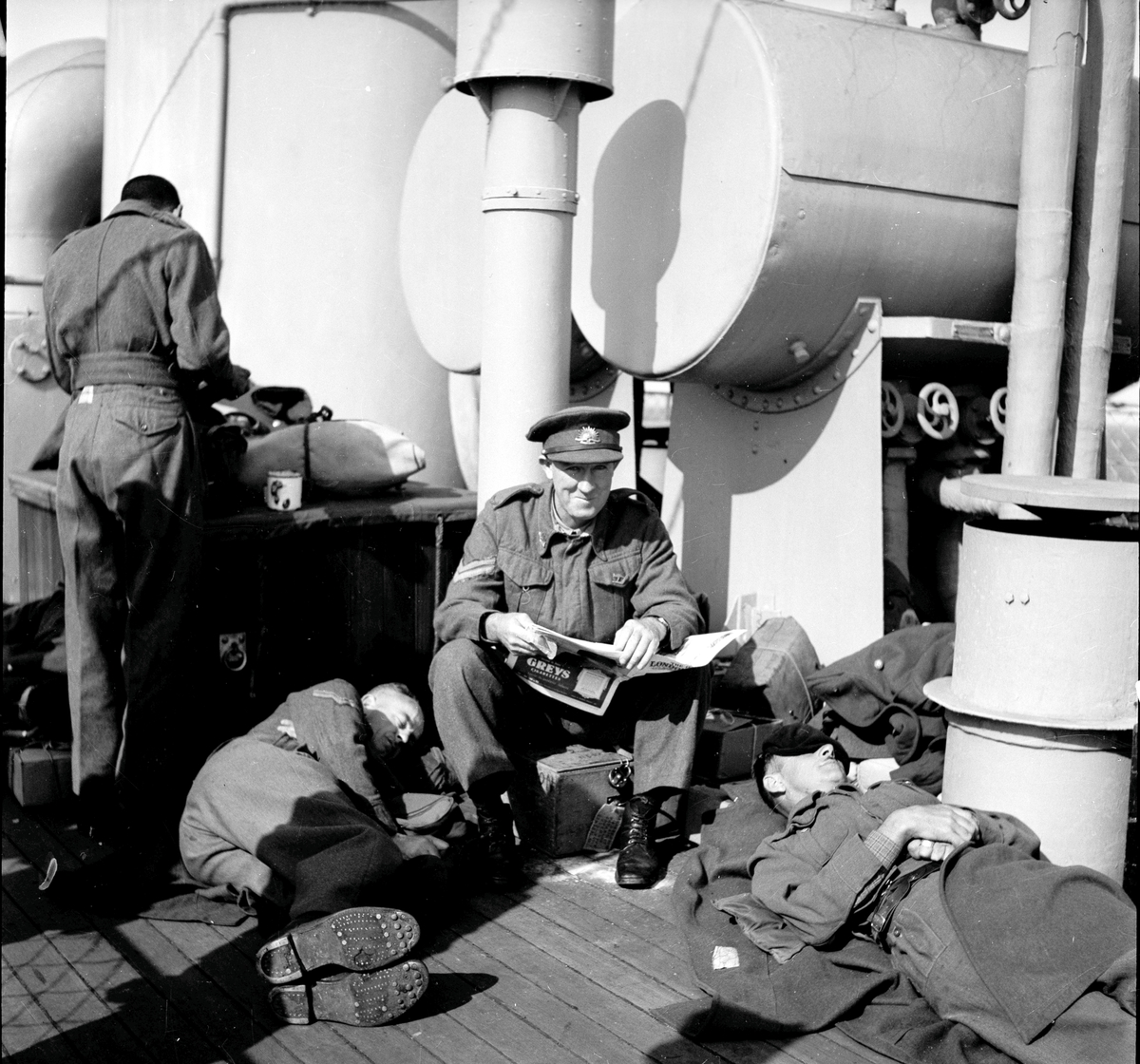 Titel: Krigsfångeutväxling i Trelleborg. Vila och tidningsläsning.